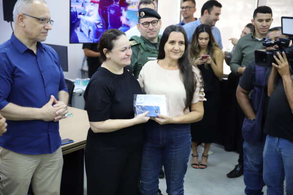 A superintendente da Supesp, Juliana Barroso, entrega o celular durante balanço dos 18 meses do programa apresentado pelo governador Elmano de Freitas e o secretário da Segurança, Roberto Sá