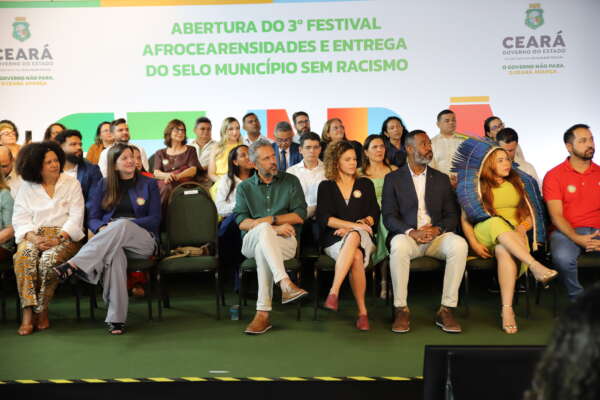 A Superintendência de Pesquisa e Estratégia de Segurança Pública (Supesp) participou, na última sexta-feira, 07/11, da abertura oficial do III Festival Afrocearensidades, realizada no Palácio da Abolição. Na cerimônia também foi realizada a entrega do selo Município Sem Racismo, ocasião que busca reconhecer as iniciativas de valorização e fortalecimento para a população negra, além de povos e comunidades tradicionais, como quilombolas, ciganos e povos de terreiro em todo Ceará.